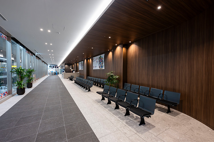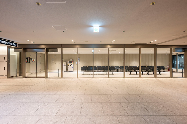 1階に位置する駅の線路を一線廃止し、2階バスターミナルへと続く動線を確保。明るく開放的な駅と一新されたバスターミナルをつなぐ連絡通路は、上質で落ち着いた空間に。曲線を多用した柔らかいデザインとすることで、旅に出る期待感を醸成しています。また、柱片側のみを曲面壁で覆うデザインによって、通路の行き道と帰り道の表情に変化をもたらしています。