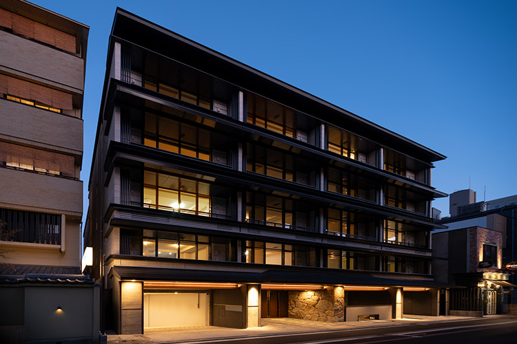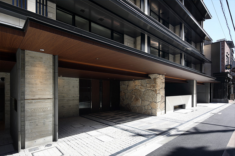 外観デザインは、多段構成の庇によって水平ラインを分節化。さらに前面道路側に対しては意匠柱と縦格子による縦の分節を行うことで、通りに面する京町屋の間口寸法に可能な限り近づける構成とし、周辺環境に馴染む佇まいとしました。