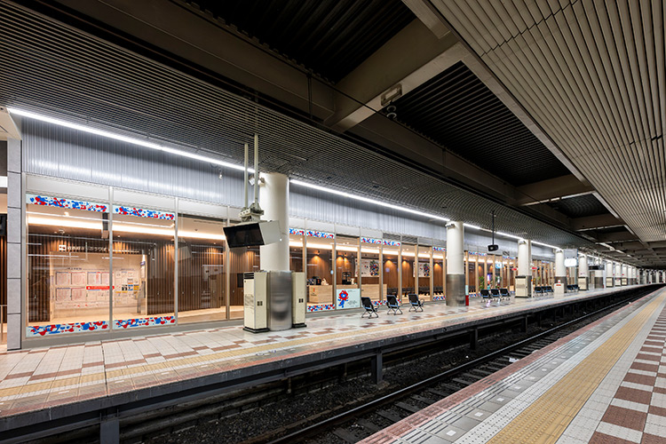 バスターミナルは天井全体にライン照明を配置。さらに発着エリアを二重の光の輪で囲うことで、バス専⽤エリアを明確にするデザインとしています。また、エリア内の12本の柱には10色のタイルをグラデーション状に貼ることでエリアを包み込む光を表現し、目的地へと旅立つ期待感と高揚感を演出しています。
