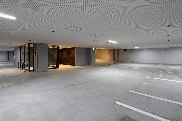 周辺建物への影響を考慮し、既存の地下躯体を活用して地下平面駐車場を設置。環境負荷の低減を実現させました。