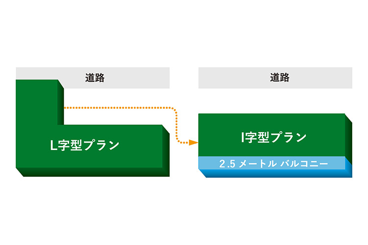 建物は、北側道路に圧迫感を与えないよう極力南へ寄せ、I字型に配置しています。これにより生まれた余剰容積率を活用し、バルコニーの奥行を2.5mに設計。南側眺望手前に余白を造ることで空間的な広がりを演出しています。