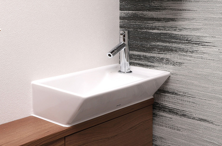 トイレには衛生的な手洗いカウンターを設置。また、立ち座りをサポートする手摺も設けています。