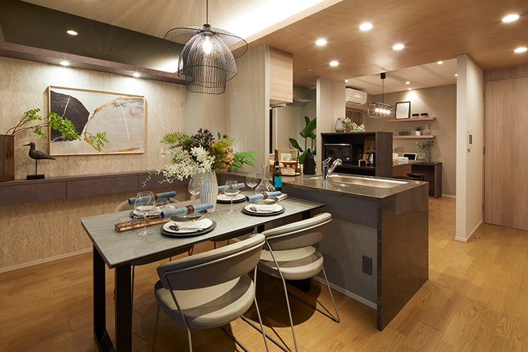 「ダイニングは、キッチンやキッチンスタジオ、リビングとのつながりを考慮しながら、上質さを意識しました。リビングやキッチンスタジオが比較的カジュアル寄りなので、空間をまたぐことで雰囲気の変化を楽しめるようにしています。また、奥の壁には間接照明とアートを設えてフォーカルポイントに。ダイニングはグレーで統一し、テーブル天板は石目調を用いて上質感を出しながら重々しくならないように配慮。ペンダントライトも黒のアイアンで直線的なデザインを選び、落ち着いた印象を与えています」