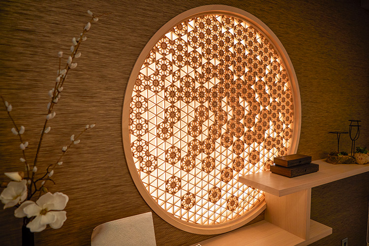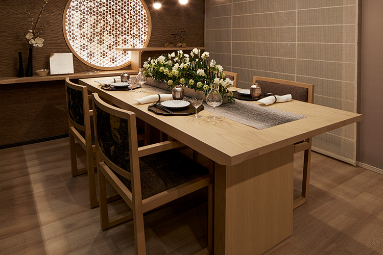 「ダイニングは、伝統的な雰囲気を持たせています。たとえばテーブルは、接着剤を使わず組まれているような建築的なデザインに。ダイニングチェアは、畳でも使用できるロの字型の脚のデザインをセレクトし、背の部分には西陣織をあつらえています。また、ダイニングのフォーカルポイント(焦点)として、壁面に間接照明と組子を配置。組子は、物件の所在地である東桜町にちなんで桜の伝統模様を施し、桜の花びらが上から下へと散っているような動きのあるデザインにしています」