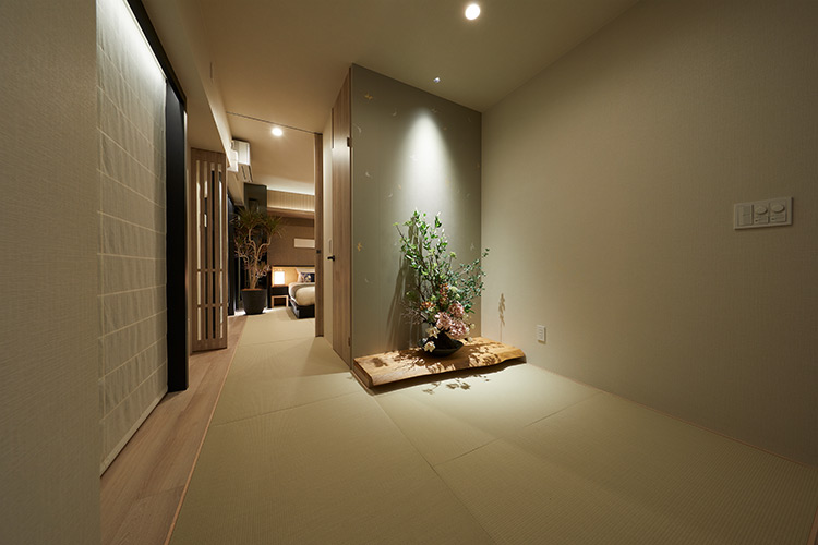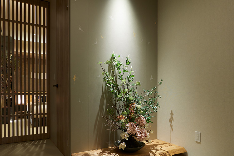 「テーブルなどの家具を置いて固定的な使い方をするのではなく、多用途で使えるように設計。リビングの一部としても、寝室の一部としても使えますし、来客時はゲストが宿泊する部屋にも。それほど広い和室ではないため、間や余白を意識して、あえて置くものは花台だけにとどめました。壁は少しグレーがかった色味にし、花を飾る背面の壁には、京都の唐紙(からかみ)を採用。ベースとなる地紙にスタンプのように柄を押していくのですが、今回は花とのバランスを見ながら、柄を押す位置を上の方に調整。壁紙自体がディスプレイとなるよう工夫しています」