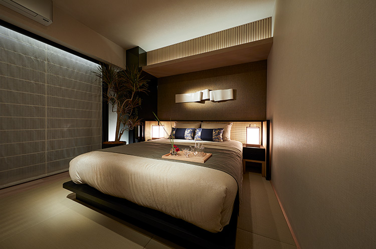 「寝室は、海外の方も利用する京都のホテルを参考にし、和室とつなげて畳敷きにしました。京都だからこそ『和室に洋のベッドを置く』というスタイルを採用。足触りの良さや柔らかさといった機能的なメリットがあります。また、ベッドのクッション部分にブルーの西陣織を使ったほか、屏風からインスピレーションを得た籐をヘッドボードに貼り込み、ナイトランプの優しい光で陰影を出し、ベッドまわりに温かみを演出しています」