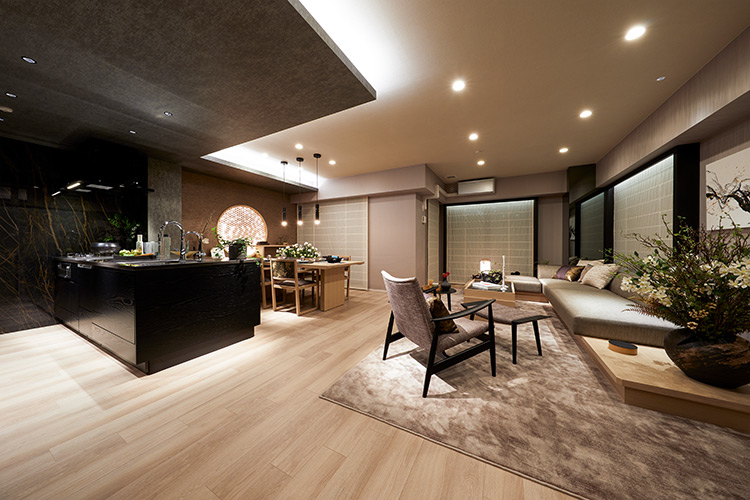 「まず、色使いはなるべく絞ることですね。そして、絞った色を空間全体に分散させることが大切です。例えば、今回のモデルルームでは、キッチンで用いた締め色の黒を、ラウンジチェアの脚やリビングテーブルの天板、ダイニングのペンダントライトなどに用いています。そうすることで空間にまとまりが生まれます。 次に重要なのが照明です。どんなに良い空間でも照明が悪いと台無しになってしまいます。天井の照明だけでなく、スタンドライトや間接照明を取り入れるだけで雰囲気は劇的に変わります。リビングの隅に行灯のようなスタンドを置くだけでも、夜の雰囲気がとても良くなります」