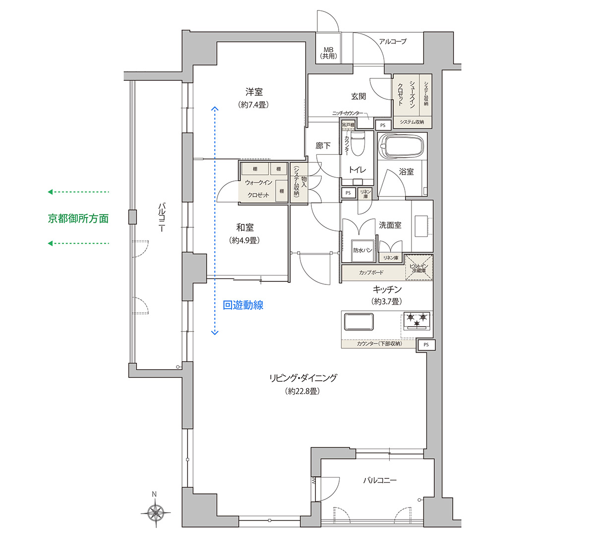 「ホテルのスイートルームらしさとして特に意識したのは動線ですね。室内の扉を全て開け放つことで、リビング・和室・寝室(洋室)がぐるりと回遊できます。また、その動線は眺望が良いバルコニー側を歩けるように間取りや家具の配置を考えました」