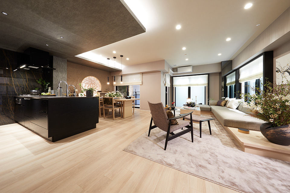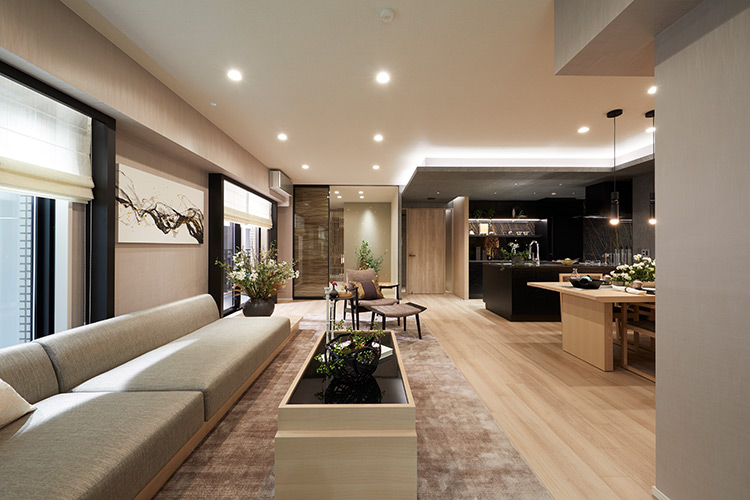 「一昔前は、ラグジュアリーなインテリアをつくるために、ダーク系のカラーでまとめることが多かったですね。最近は、明るいトーンが主流で、五つ星ホテルなども明るい傾向にあります。ただ、明るさの中に高級感を出すには工夫が必要です。今回は床や建具に明るい色合いを使う一方で、キッチンや家具の木部には黒などの締め色を用いています。また、建具や家具の質感にこだわり、陰影をつけることで単調にならないように配慮しています」