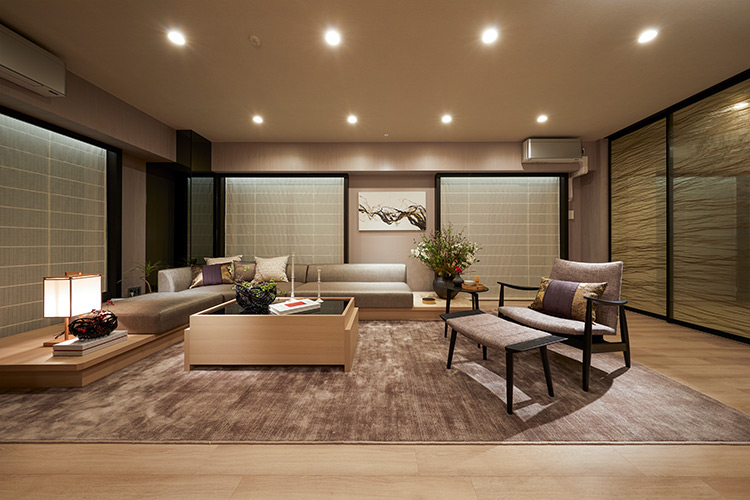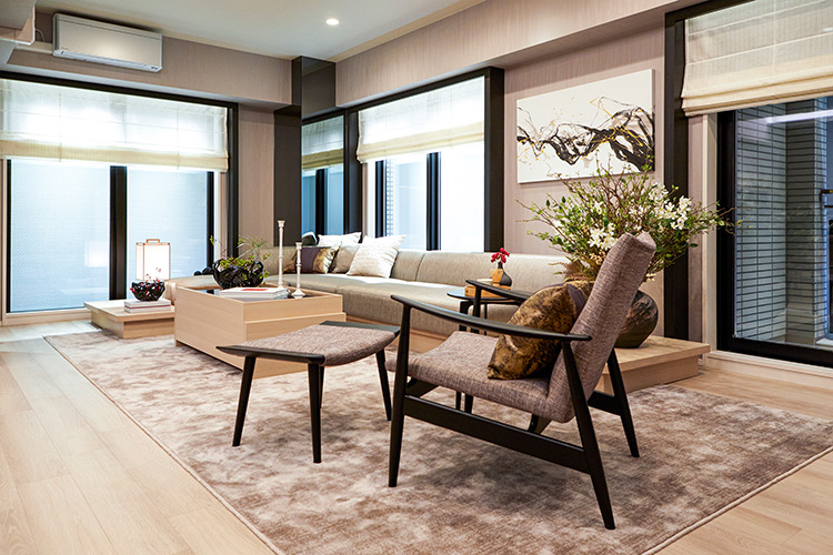 「まず今回のコーディネートで重要視したのが、眺望です。窓のサッシに黒いコの字型の「門型」のフレームを付けることで、眺望をピクチャーウィンドウのように切り取り、借景として取り込めるようにしています。この眺望を遮らないように、リビングのソファは通常よりも高さを低く設定。また、リビングテーブルの天板には漆のような艶のある黒を使って空間のアクセントに。リビングのラウンジチェアは『日本刀』をモチーフにしたもので、本物件のイメージに合うものを探してセレクトしました」