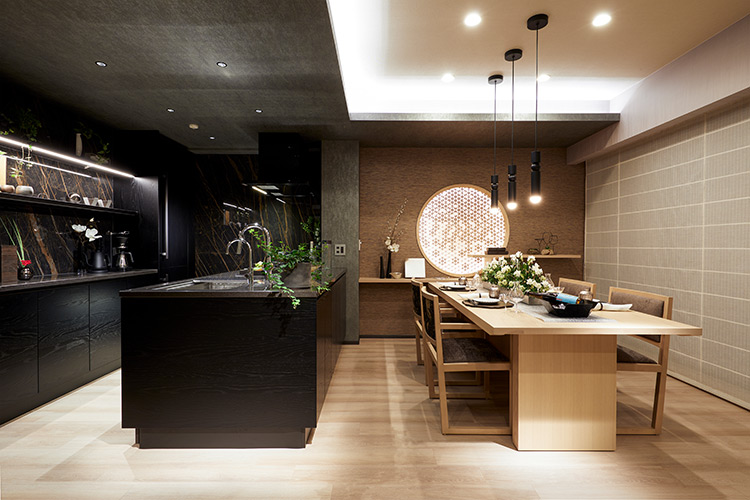 「黒といっても墨色のようなニュアンスを意識しました。真っ黒にならないよう木目の凹凸を強調した浮造り(うづくり)調の素材にして光の反射を抑えたり、少しオレンジ色の柄が入った大判タイルを選んだり、素材にはこだわりました。あえてキッチンを黒い塊として見せることで、空間全体が明るくなりすぎず、単調にならないようにバランスを取っています。実際の生活でも、お客さまを招く際にキッチンが丸見えでも黒で統一していると生活感が出にくく、空間が凛としてフォーマルに見える効果も。視覚的な効果に加え、黒は汚れが目立ちにくいという機能的なメリットもあります」