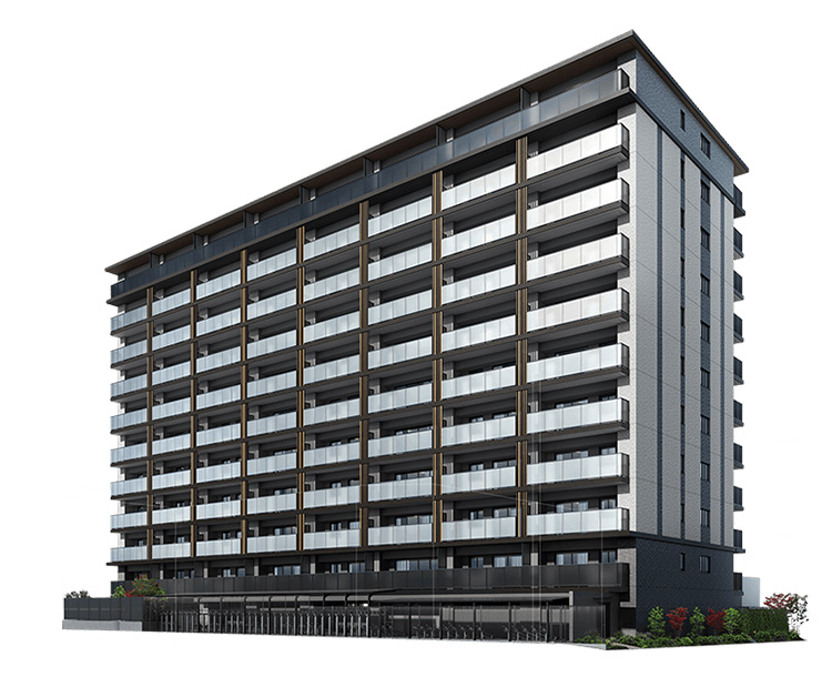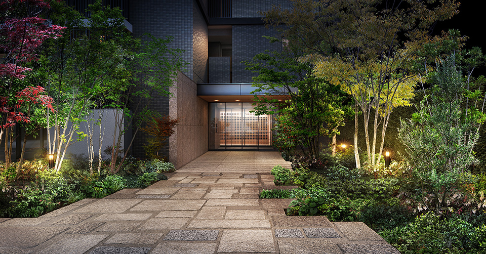 ローレルコート橿原神宮前イーストレジデンスは、その立地にふさわしいデザインを追求。建物外観は、伝統様式を現代的にアレンジした和モダンなデザインが印象的です。規則正しい水平ラインを際立たせ、伝統的な意匠をイメージして各スパンに縦格子を用い、風情ある表情を演出。また、アプローチは格式高い雰囲気を醸し出す石畳を配し、さまざまな植栽を豊富に植え込み、彩り豊かな風景を創り出します。