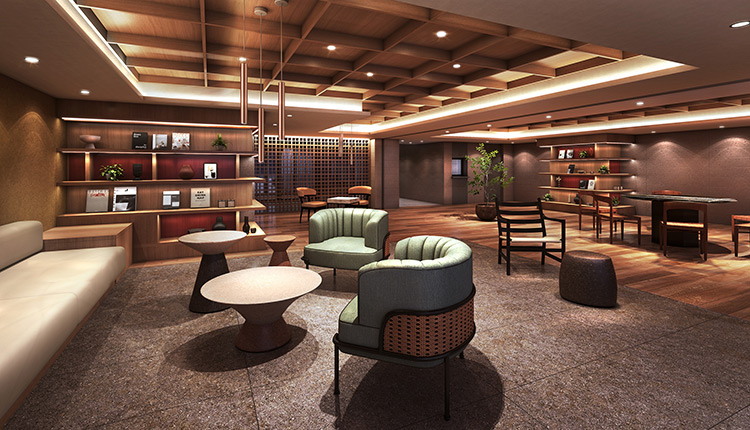 エントランスホールには、開放感あふれる広々としたラウンジをご用意。高級ホテルにあるような贅沢なラウンジをめざし、透かし格子や格子天井などアースカラーで統一した落ち着きのある和モダンな空間を設えます。