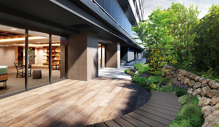 エントランスホールに隣接する中庭を開放感のあるアウトドアリビングに仕立て、心地よく寛げる空間に。総80邸の規模ながら共用部のゆとりと上質感も本物件の魅力のひとつです。