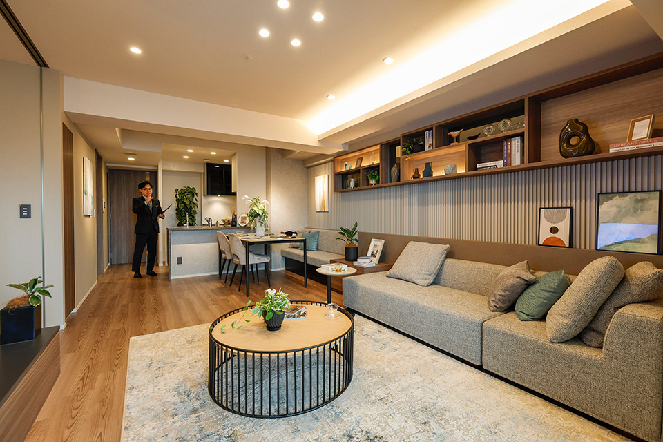 ※本コンテンツ掲載の完成予想図およびイメージイラストは設計図書を基に描き起こしたもので、実際とは異なります。また、官公庁の指導、施工上の都合により建物の形状・仕様・色調・植栽等に変更が生じる場合があります。外構形状の細部、設備機器等は表現しておりません。なお、植栽は竣工時には完成予想図程度には成長しておりません。※モデルルーム写真は、モデルルーム(Eタイプ・モデルルームプラン)にて2025年3月・2025年10月に撮影したもので一部オーナーズデザイン等のオプションが含まれております。タイプにより、室内の形状、色調、仕様等は異なります。家具・調度品類等は販売価格に含まれておりません。予めご了承ください。※詳しくは係員にお尋ねください。