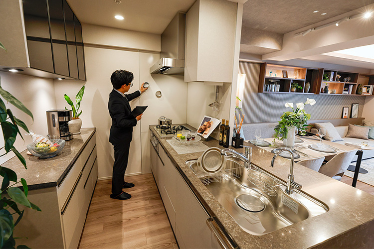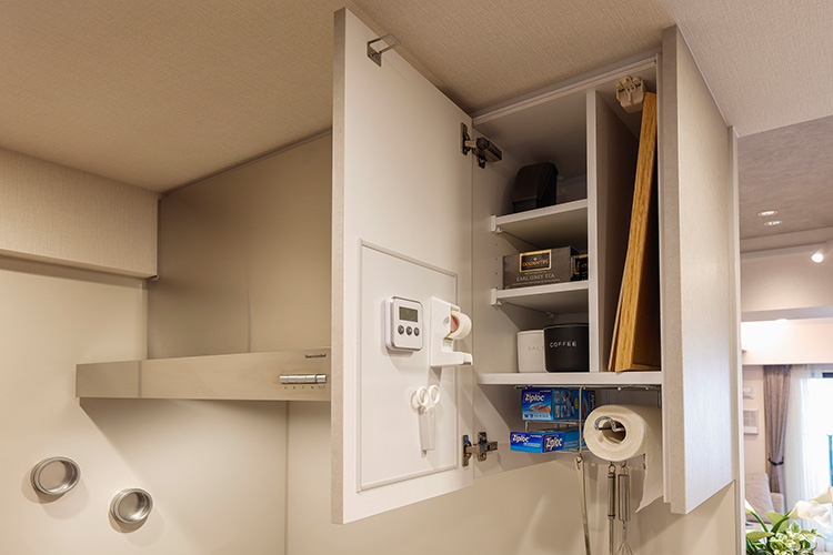 キッチンには、食器洗い乾燥機やビルトイン浄水器、スタイリッシュなステンレス製レンジフードなどを標準装備。また、キッチンペーパーやラップなどを使いやすく収納できる吊戸棚を設置。こちらの扉裏やコンロまわりには、マグネットが使用できるホーローパネルを採用しています。