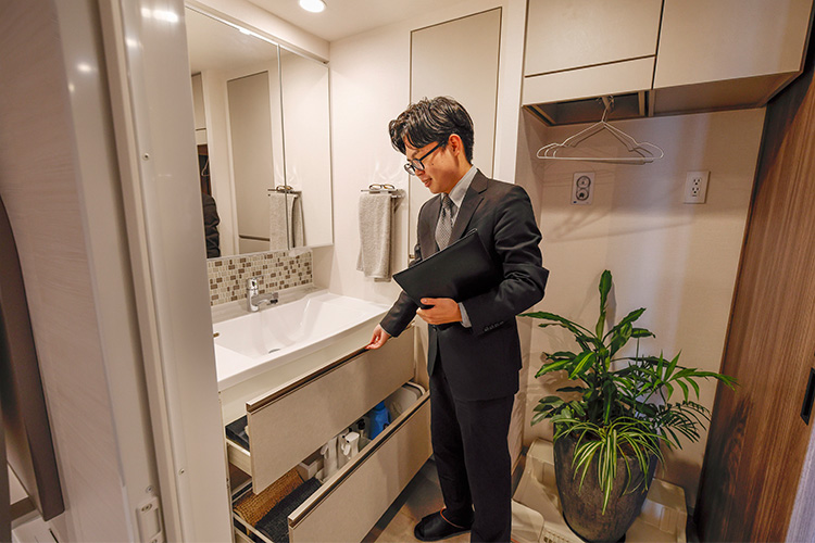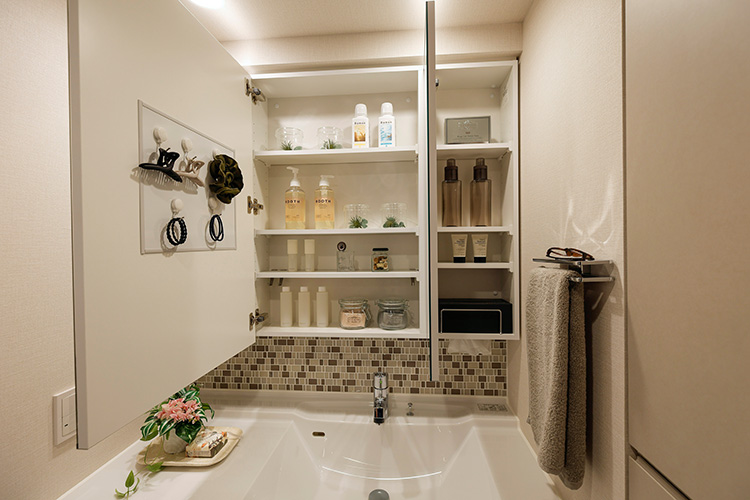 洗面化粧台は、奥の物まで取り出しやすいスライド式の引き出しを設置。鏡裏収納には、マグネット式のフックなどを付けることができる「鏡裏ホーローパネル」や、扉に触れずに下からティッシュを取り出せる「ティッシュボックス収納スペース」もご用意。
