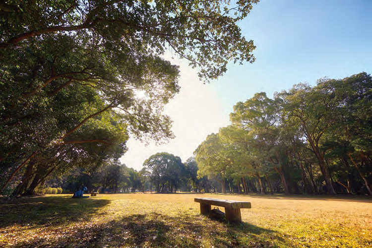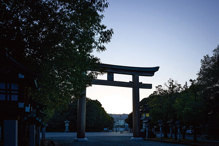 橿原は『日本書紀』で日本建国の地と記され、神武天皇がこの地で即位し、橿原宮を創建したと伝えられています。そんな由緒ある橿原神宮は、畝傍山を借景とした美しい景観が広がり、清浄で厳かな空気が漂います。外苑としてのびやかな森林遊苑も整備され、潤い豊かな環境を身近に愉しむことができます。