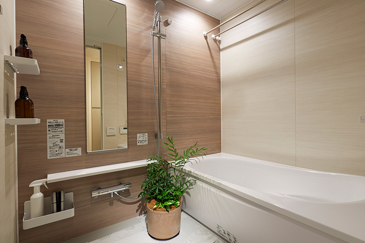 浴室は、ミストサウナが楽しめる「ミストカワック」をはじめ、畳のようにやわらかくお手入れしやすい「お掃除ラクラクほっカラリ床」などを採用。また、浴室に入ることなく栓を開閉でき、 毎日の手間を軽減する「自動排水栓」も標準装備しています。