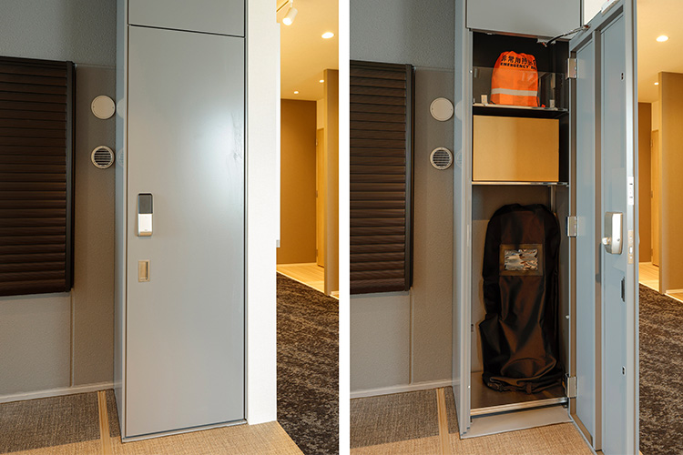 宅配ボックスと防災備品収納スペースが一体となった近鉄不動産オリジナルの各住戸専用の宅配ボックス「ローレルボックス」を設置。玄関前に設置されているため、重い荷物も玄関先で受け取れて便利です。