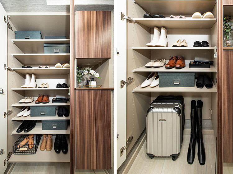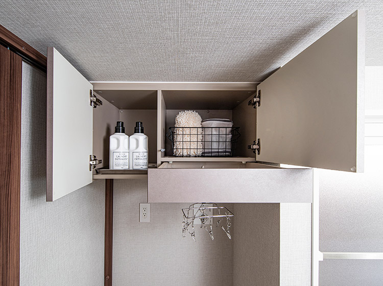 L‘skitは、「しまう」+「取り出す」に「使いやすい」をプラスした近鉄不動産オリジナル仕様です。玄関に設置する「シューズL’skit」は、靴や傘など外で使う物と、スリッパや衛生用品などを分けて収納できるなど、細やかな工夫を盛り込んでいます。また、洗濯機置場上部の空間を有効利用した「ランドリーL’skit」は、ちょっと物を一時的に掛けられるマルチポールなどを設置。洗剤スペースには、液だれ防止にステンレストレーをご用意。