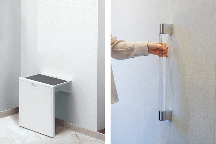 あらゆる世代にやさしい永住仕様「エイジング・フリー」を導入。玄関には収納ベンチ・手摺を設置するほか、廊下は将来の手摺設置や介助なども考慮し、廊下幅を壁芯約1m(有効幅は約900mm)に設計。手摺を取り付けるために必要な下地補強をあらかじめ施しています。このほかにも、コードに足を引っ掛けて転倒することを防ぐ「マグネット付コンセント」など、長く安心して暮らせるためのあらゆる世代にやさしい仕様を採用しています。