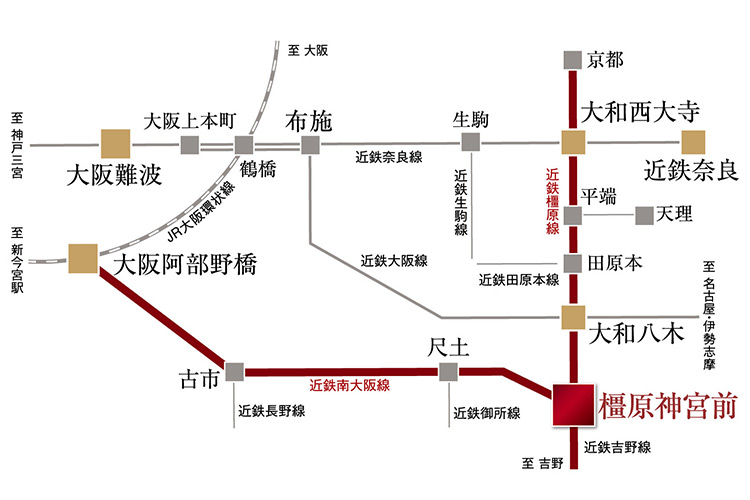 近鉄南大阪線・橿原線・吉野線が交わるターミナル「橿原神宮前」駅は、「近鉄奈良」駅へ39分(42分)、「大阪阿部野橋」駅へ47分(42分)。始発駅のため、毎日の通勤・通学も快適です。また、特急も停車し、奈良や大阪方面、さらには京都までスムーズなアクセスを実現。