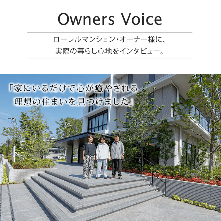 奥様「敷地内に植栽が豊富で、マンションの景観がとてもいいですね。特に夜のライトアップが綺麗で、仕事から帰ってきたときに気持ちが和みます。あと、宅配ボックスもすごく便利です。エントランスに入ると、荷物が届いているかどうかすぐに分かるんです。家に入って気づいて、またエントランスに戻るという手間がないのがうれしいですね」