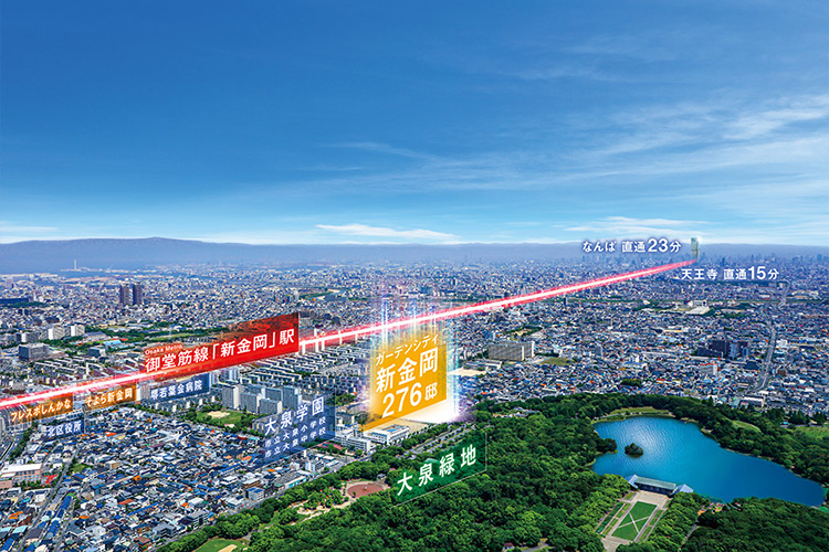 ※航空写真は、現地周辺を撮影(2023年2月)したものにCG処理を施したもので実際とは異なります。また現地の光柱は位置を示すためのもので建物の規模・高さ等を表したものではありません。周辺環境は将来変わる可能性があります。