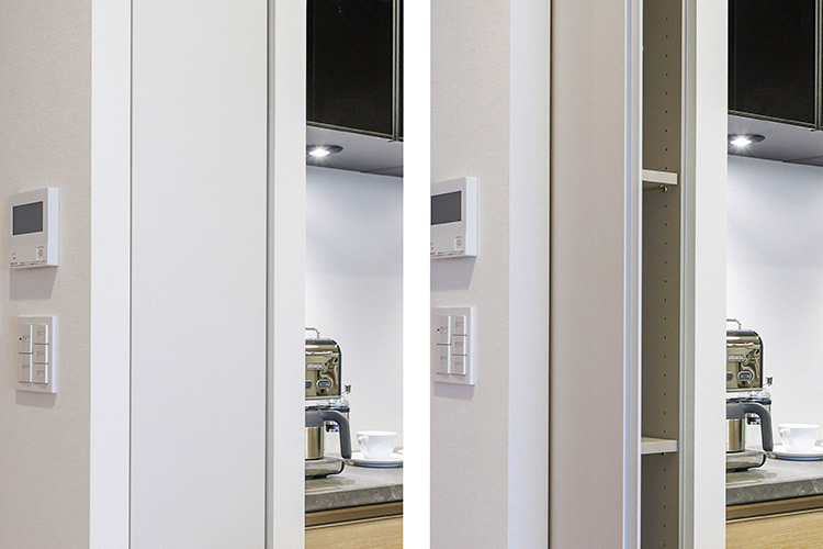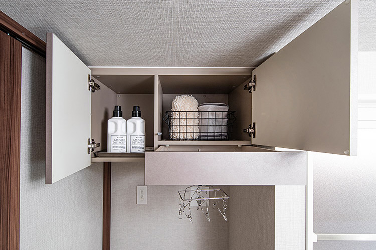 奥様「洗濯機の上に設置されたランドリーL‘skit(エルスキット)も便利ですね。ハンガーなどを掛けられるポールが引き出し式になっていて、使い勝手がいいですね。あと、洋室の引き戸にソフトクローズ機能が付いていて、特に意識しなくても静かに戸を閉められるのがうれしいです。キッチンの収納扉も、取手がなく、扉の端に持ち手になる凹みが設けられ、スッキリとしたデザインです」