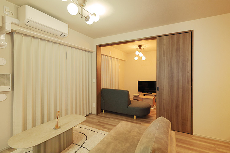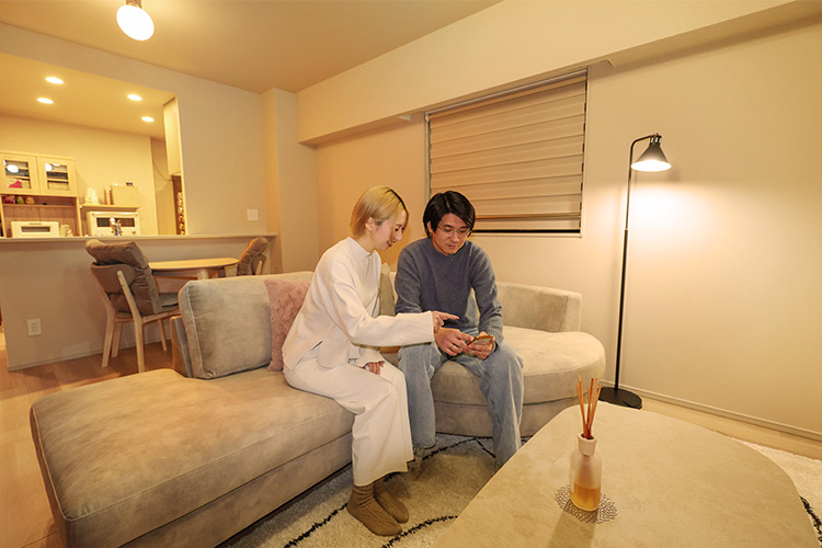 奥様「私はリビングですね。来客時におもてなしできるようなパブリックな空間を意識して、お部屋のクロスやカーテン、ブラインド、家具はベージュやグレージュ系で統一し、落ち着いた雰囲気がつくれるようこだわりました。リビングに隣接する洋室に小さめのソファとテレビを置き、普段はここでくつろいでいます」