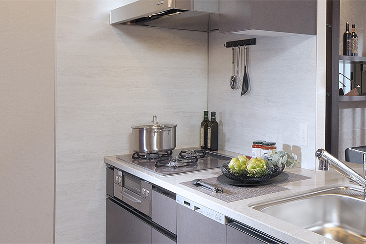 奥様「掃除が好きで、特に水まわりはいつも綺麗な状態をキープしておきたいので、こちらに入居してからも毎日のように掃除していますが、家が広くなっても全然苦にならないですね。見た目もお洒落なハイパーガラスコートトップのガスコンロや、ホーローキッチンパネルといったお手入れしやすい素材なのがうれしいです」