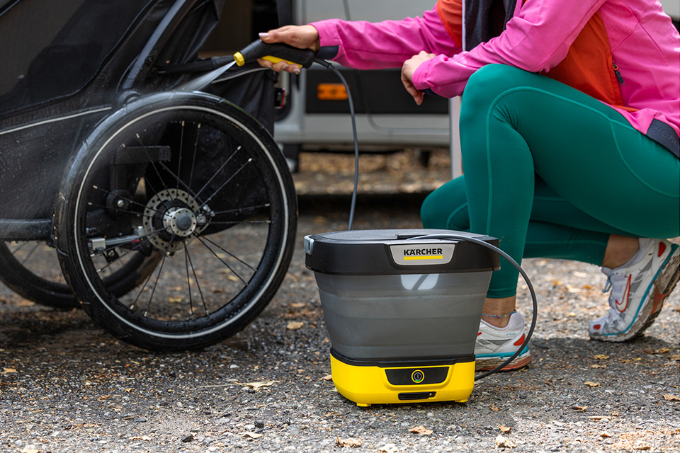 ウォータータンクとバッテリーを備え、水道や電源のない場所でも使える洗浄機。水道の約2倍圧の細かい扇状の水流で効率的に洗浄でき、40℃までのお湯が使用できます。アウトドアはもちろん、窓や網戸、バルコニー、キッチンの排水溝、浴室、エアコンのフィルターなど、さまざまな場所の洗浄にも最適。給水タンクは折りたたむと約10cmの厚さになるため、持ち運びに便利。収納スペースをとらないのもうれしいポイントです。