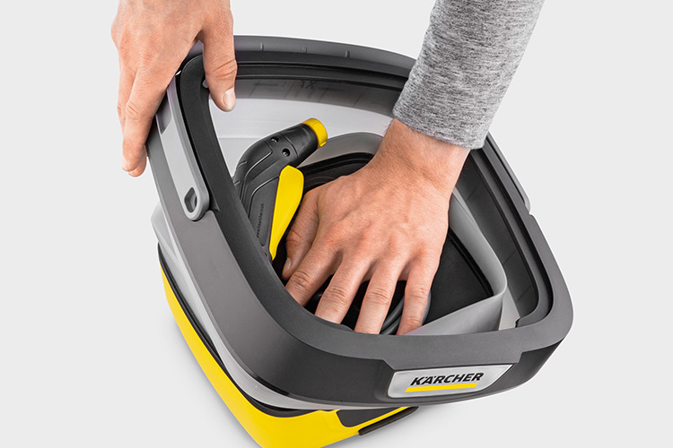 コードレス(充電式)でバケツに水を貯めるだけで使えるので、面倒な水道接続も不要。マンションのバルコニー掃除や植物の散水、玄関や駐車場、墓石の掃除など、水道栓のない場所でもどこでも高圧洗浄ができます。パワーも一般家庭での使用には十分。使い終わったらバケツを蛇腹状に折りたたんで、コード類と一緒にコンパクトに収納できるのも魅力です。