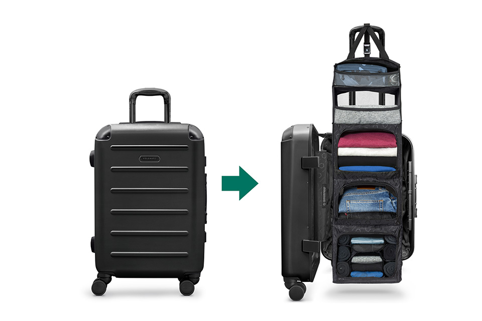 クローゼットに吊り下げる収納ラックがそのまま内蔵されたようなスーツケースです。旅先で面倒な荷解きや荷造りの必要がなくとても便利。きれいに畳まれ、仕分けされた状態で運べるので、小分けのポーチなどに入れる必要もなく、どこに何があるかも一目瞭然。時短になるだけでなく、旅先でも整然と気持ちよく過ごせる画期的なアイテムです。