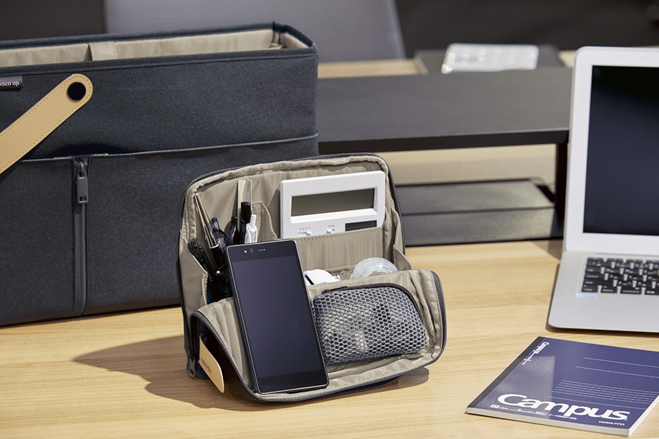 筆記具やメモ、電卓、コード類など、なにかとごちゃつきやすい文具やガジェット類を整理して収納でき、リモートワークはもちろん、フリーアドレスのオフィスでも便利です。ガバッと大きく広がって取り出しやすく、自立するのでデスクのかたわらで場所を取らず、たためば薄型でビジネスバッグにもすっと入ります。また、飛行機内や新幹線の座席前ポケットにも入るサイズなので、出張の多い方にもとても評判のいいアイテムです。