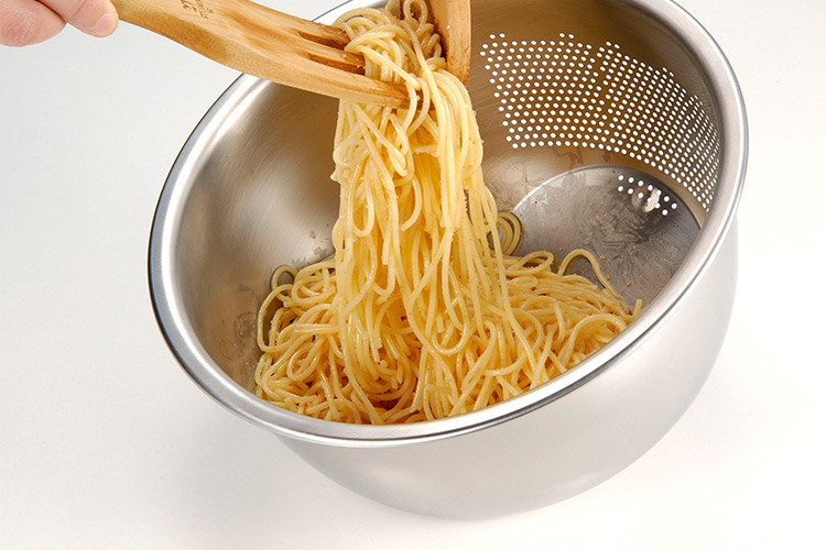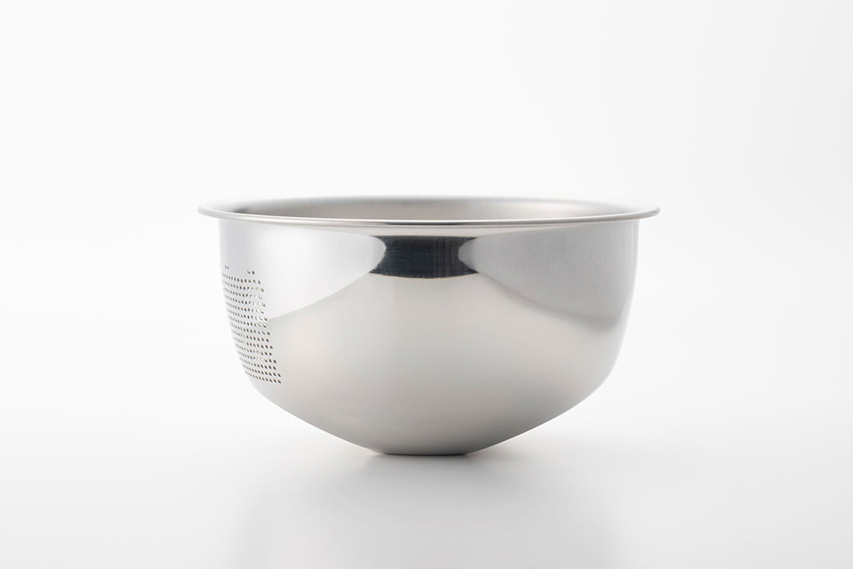 サイズは日常的に使うボウルよりも少し大きめで深さがあります。一方に傾ければボウルとして使え、一方に傾ければパンチ穴から水切りができるため、水を含ませてお米を研ぎ、逆に傾けて水を切る。茹でたパスタの湯切りをしてからそのまま反対に傾けてソースを和えるなど、あれこれ使わずにこれひとつで済んでしまうのは時短にもなり、非常に便利です。