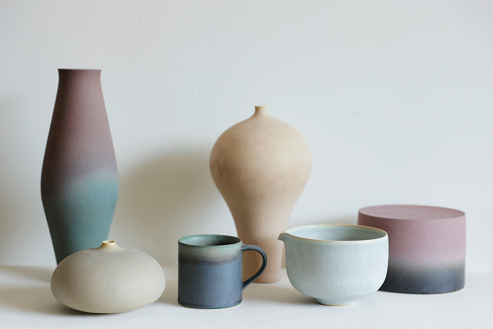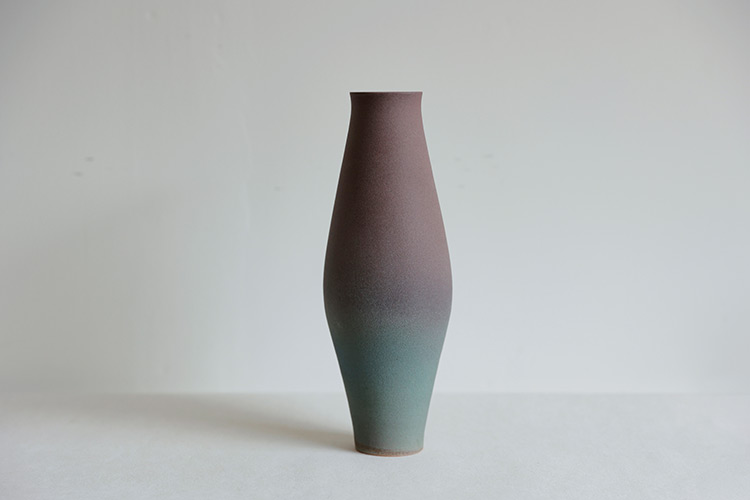 グラデーションが印象的な一輪挿しと花器。安藤さんの代名詞とも言える、吸い込まれるような奥行きのある色合いが愉しめます。花器などの一点物は、色彩だけでなくオブジェとして飾りたくなる「造形」としての魅力を備えています。