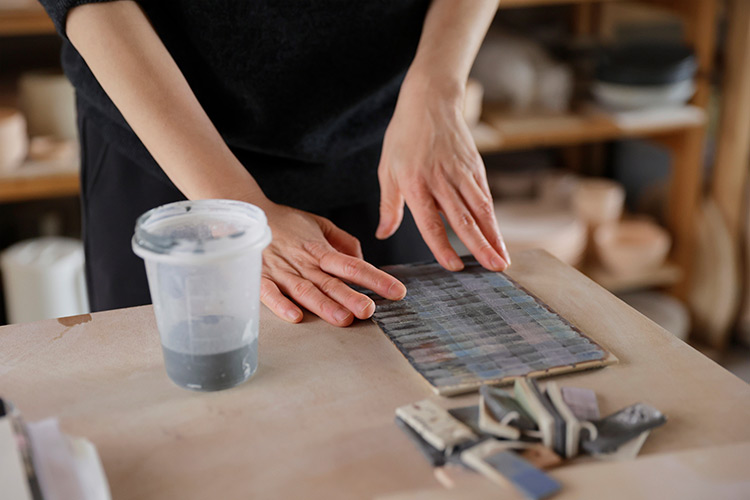 水色の再現から自然界の美しい情景を彷彿とさせる繊細な色彩へ昇華したのでしょうか。「夫の仕事の関係で富山県の氷見で暮らしていたとき、海の向こうに立山連峰が見える景色に感動しました。こうした自然の風景を見ながら色への探求心が芽生えていったと思います。淡い色合いは、『こういうものをつくりたいという憧れ』を表現した結果ですね。最近はもっと自分をさらけ出して、不安定な気持ちや悩みも作品に落とし込んでみようとした結果、奥行きのあるブラックなど、陰影や質感をより追求したダークなトーンの作品をつくるようになりました。ストイックに自分を追い込んでしまって半年ほど休んだ時期があったのですが、個展などのスケジュールに追われるのではなく、自分のペースで内面を反映させたものづくりを続けていきたいと今は考えています」