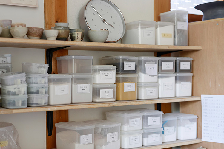 さまざまな釉薬の原料と数え切れないほどの試作品があり、まるで釉薬の実験室のよう。「釉薬の配合によってどのような色合いになるか。こうした試作は、色へのこだわりがあるのはもちろんですが、単純に好きなんです。なんか違うなと思った色でも、時間が経つと『これもいいかも?』と変わることがあるし、ある程度は狙い通りの色を出せるのですが、想定外の色が生まれることもあるので、本当に楽しいですよ」