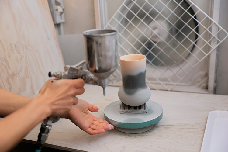 安藤さんの作品が持つ奥行きのある色彩は、どのようにして生まれるのでしょうか。「釉薬をスプレーで重ね掛けしています。3色ほどの釉薬を使い、重なり具合や厚みを調整することでグラデーションや深い奥行きを生み出すことができます。土については、最近は九谷の半磁器土を使っています。色が綺麗に出やすく、扱いやすさのバランスがちょうどいいんです」