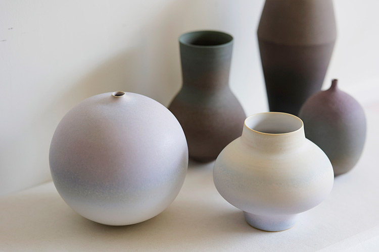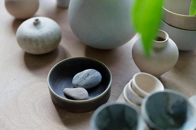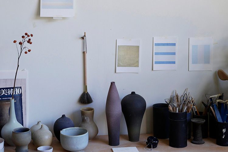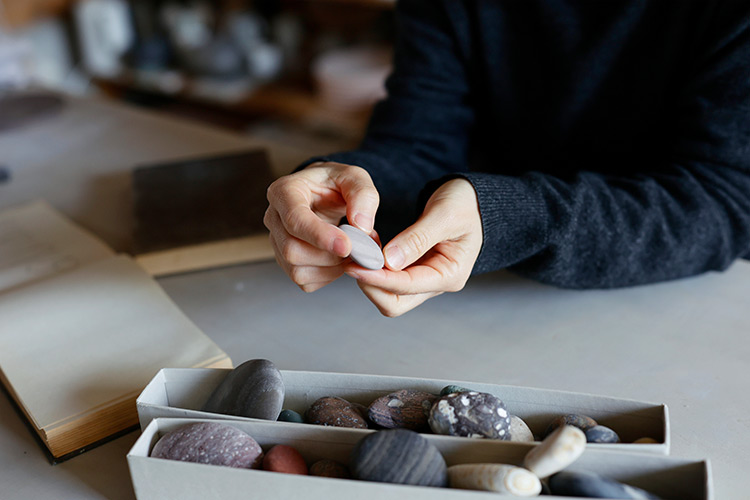 ろくろの横にはインスピレーションを受けているという作品のポストカードも。「抽象画で知られる画家のアグネス・マーティンの作品に心惹かれます。一見シンプルですが、じっと見ないと分からないような繊細な表現に奥行きが感じられるんです。あと、美しい石ころを集めているのですが、色の層や質感がすごく魅力的で、こちらもインスピレーションのもとになっています」