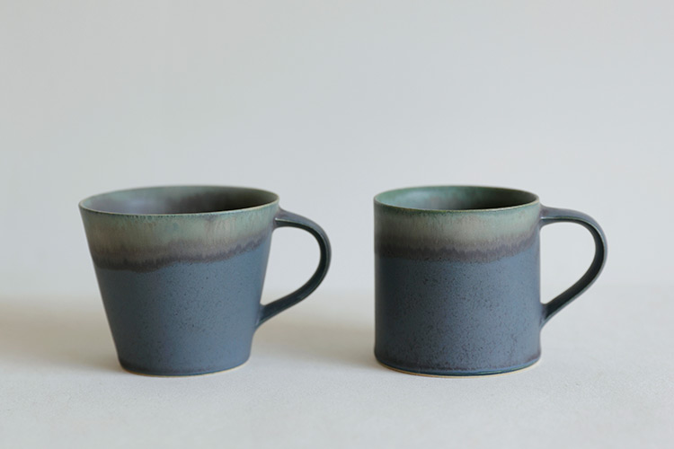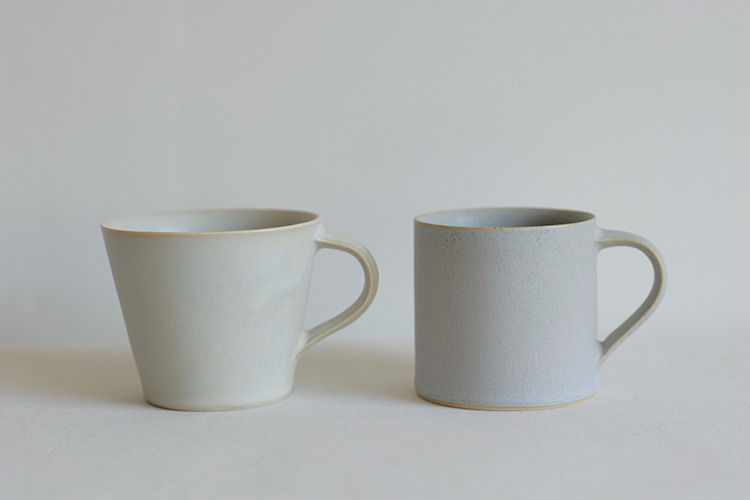 日常使いのものはプロダクトデザインの考え方でつくるという安藤さん。マグカップはミリ単位の調整を重ね、美しいラインと絶妙なサイズ感が特長です。半磁器のスマートな厚みによって、軽さと持ちやすさ、優しい口当たりといった機能性も秀逸。フォルムは台形と筒型の2種類をラインナップ。