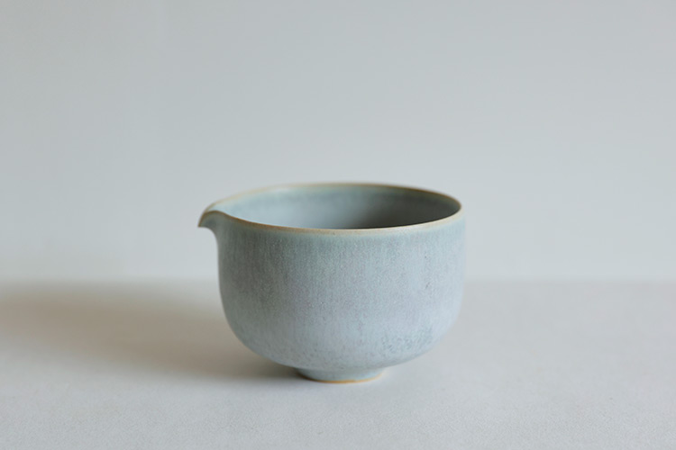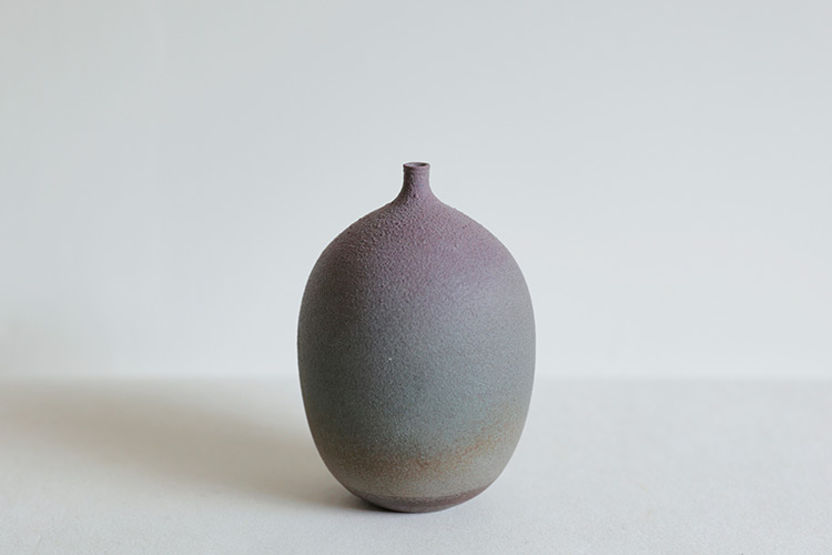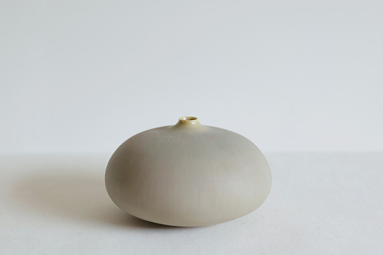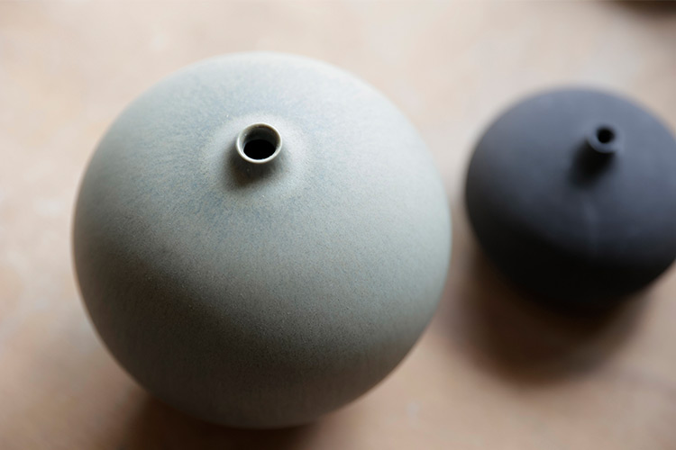 静謐な佇まいの片口茶碗と一輪挿しは、愛らしいフォルムで飾るだけでも絵になる作品。鳥や犬など動物の身体が持つ可愛いらしい曲線など、日常で心惹かれた自然の造形が無意識のうちにモチーフになっているそうです。